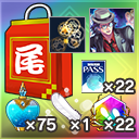 行動P全回復×75、★1スキル強化×1、★5万能ルーツ×22 、ステージパス×22、EF:にくきゅう乱舞(黄)、